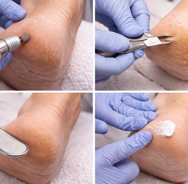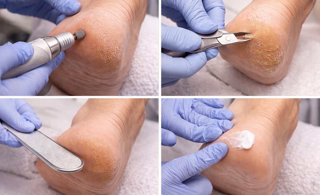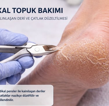 Medikal topuk bakımında, steril cihazlar ile kalınlaşmış deri temizlenir, çatlak bölgeler özel tekniklerle düzeltilir ve cilt yenilenir. İşlem tamamen hijyenik ortamda uygulanır.